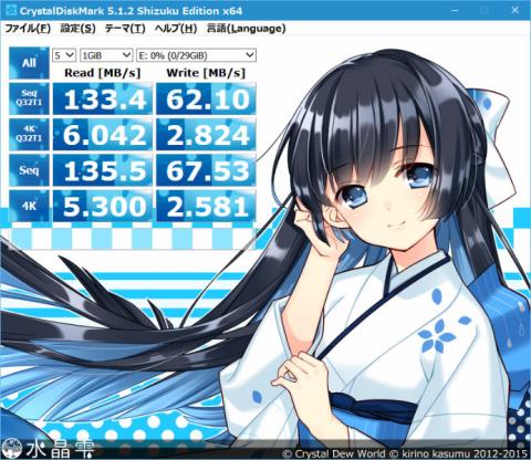 CristalDiskでベンチマークを、小さめのファイルがHDDよりは速そうなので、OSを入れても体感的にはHDDよりも速そうですね。