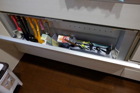 このドアポケット一回押して開くと、扉の前に隠し扉が開き、そのまま引くと、シンクしたの引き出しが出てきます(写真下)