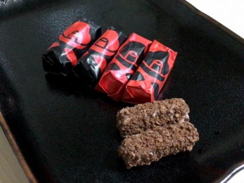 チョコレートは2種類あって、黒い方は「カフェオレ味」、赤い方は「ストロベリー味」。