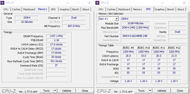 CPU-Zを見てみると、DDR4-2400 デュアルチャンネル動作 32GBとして認識されています。
