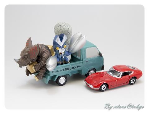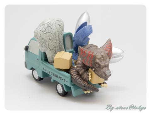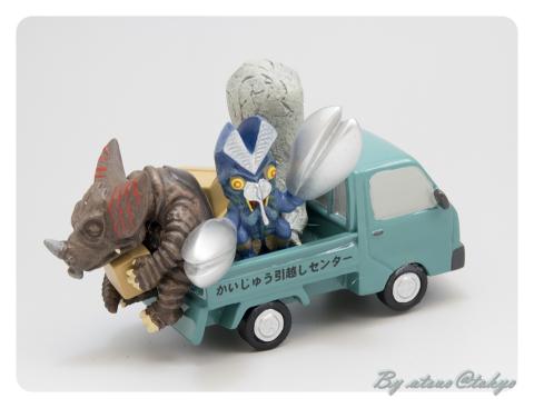 ゴモラとバルタン星人とジャミラが、かいじゅう引越センターのトラックに荷物と共に載せられています。