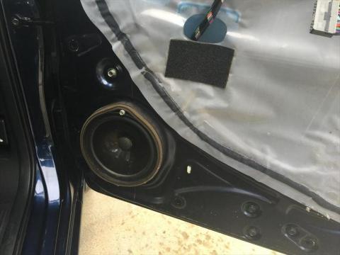 交換前の純正品のスピーカーだ。お世辞にも良いものとは言えないが最低限の役割は果たしていた。これを新しいスピーカーと交換して、デッドニングを施すと下のようになる。