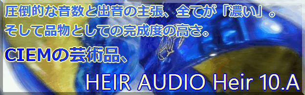 全体を通すとさすがに10ドラ、もの凄い音数で、でもそれが密集していなくて広いので良く聴き取れる。低音域は低音厨御用達CIEM「Heir 8.A」を造ったHEIR AUDIOの隠せない血か、ガッツリとはあるのだが、(試聴機での比較だが)あれほどアツアツのギガ盛りではなく、もう少し冷めたエッジの立った音。でもそれは「Heir 8.A」との比較であって、一般的には十分大盛りの部類ではあり、音の傾向もCOOLというより、WARM(HOTではなく)。