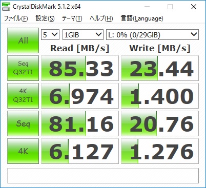 番外になりますが、内蔵メモリのパフォーマンスを、CrystalDiskMarkで計測してみました。