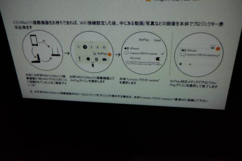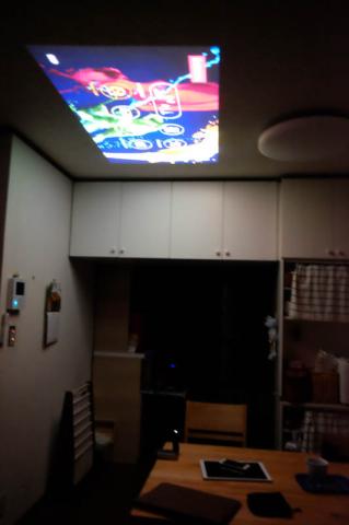 こんな感じで・・・我が家には広い壁が無いので、天井に投影したものを写メってます。ここから、VIDEOCAST,IOSのミラーリング、アンドロイドへの出力、windows10との接続(miracast が対応している機種であれば接続できるそうです)と接続できます。※インターネット環境であれば、このプロジェクターを、ネットワークに参加させて、インターネットを使用しながらyoutubeなどを投影することも可能です。ダイレクトにiphoneを接続すると、インターネットにつながらない・・・となるので、このあたりは設定が必要となります。