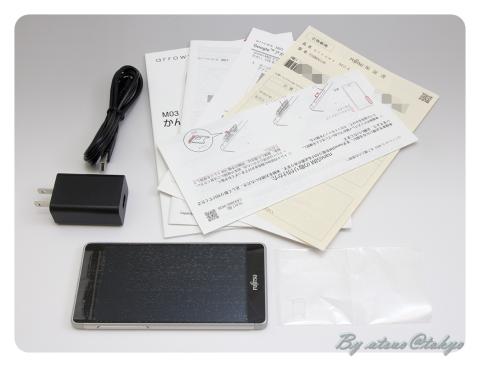 添付の紙類は「nanoSIMの取り付けかた」(A4 1枚)、「Googleアカウント新規登録操作手順」(A3四つ折り 1枚)、「arrows M03をお使いになる前に '16.6」(小冊子)、「M03 かんたん操作ガイド」(2色刷りカラー小冊子)、保証書が入っています。