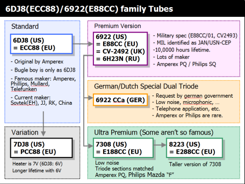 6DJ8 の電気的特性の要求事項(寿命や特性のばらつきなどの条件)を厳しくしたのが 6922 だそうです。