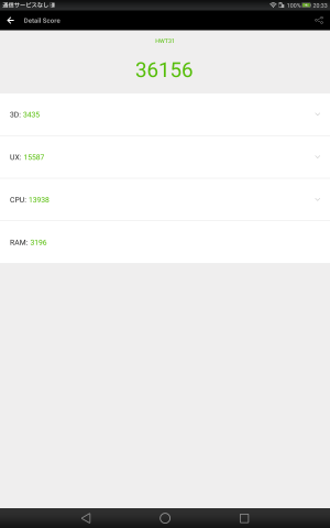 同じSoCを搭載しているQua tab 01の 34282 より若干高いスコアです。