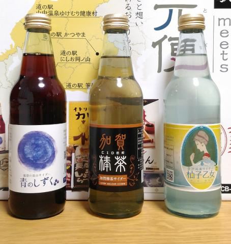 サイダー3本。左から「能登の里山サイダー 青のしずく」「加賀棒茶サイダー」「金沢湯涌サイダー 柚子乙女」。なんとなく惹かれるのは見た目にもサイダーな柚子乙女かな。