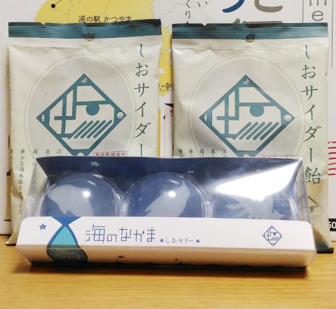 しおシリーズ。奥から「しおサイダー飴」「海のなかま しおゼリー」