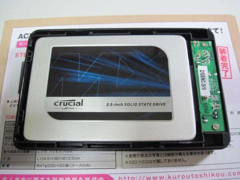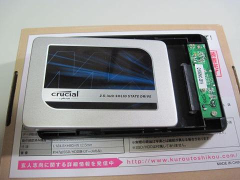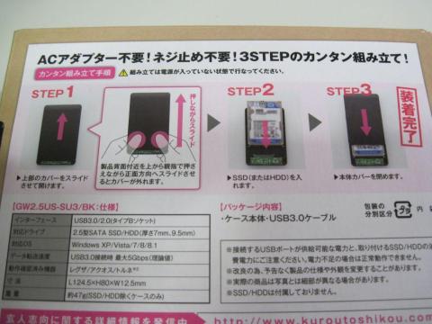今回選んだ外付けケースは「玄人志向 GW2.5CR-U3」だ。このケーは激安803円税込みだが、一つ理解して購入しないといけない点がある。「3Gbps」対応の変換になるというものだ。パッケージにはUSB3.0の理論値5Gbpsと記載してあるが、6Gbps対応とはいっさいうたっていない。事実、外付けでベンチマークを取ると半分程度のスピードしか出なかった。値段のやすさで選択して構わないという人向けだ。