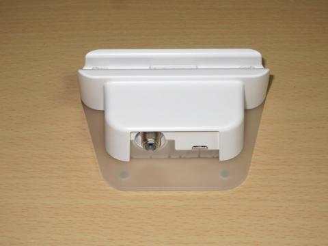 地デジ視聴には必須のアンテナのF型コネクタも背面に用意されています。F-02FではmicroUSB端子に変換ケーブルを使用して本体に直接接続していたわけですが、F-03Gを据え置きタイプの液晶TV代わりに利用する場合には卓上ホルダに本体をセットするだけで済むので、こちらも良い改良と言えます。