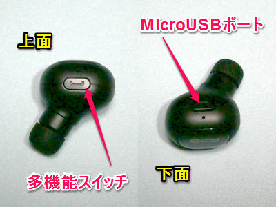 装着した際に本体サイドのQCYの文字が天地正しくなるように見た場合の上面に多機能スイッチ、下面に充電用のMicroUSBポート。