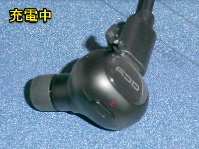 充電中。本体に差しているMicroUSBのケーブルを見ればイヤホン本体の小ささが良く判ります。