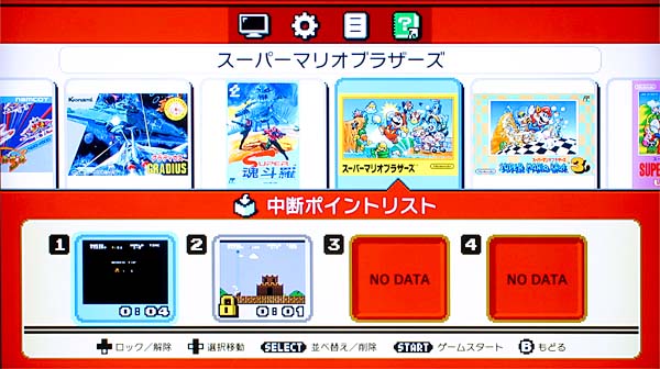 オリジナルファミコンでは、リセットボタンがプレイ中に押されようものなら大変な騒ぎになったものですが、クラシックミニでは中断ポイントが作成されるだけですので無問題です。