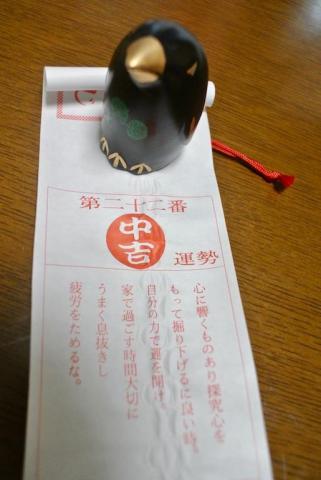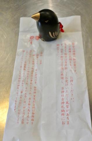 黒い身体に綺麗な緑の双葉葵と、金色のくちばし・3本の足先が描かれており、底の封を破り赤い糸を引くことでおみくじを見る仕組みでした。