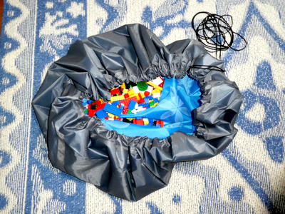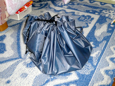 丸いマットの周囲の部分に紐が通っていて、紐を絞ると巾着状になってお片付けが出来る、という物になっています。