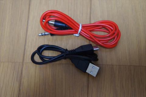 オーディオケーブルと、充電用のMicroUSB-USBケーブルが付属しています。