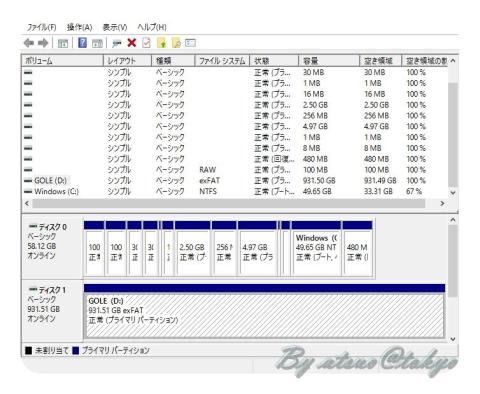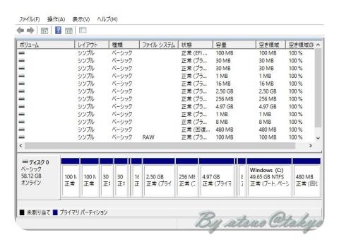 以前よりデュアルOSだとどの様にパーティション分けされているのだろうと気になっていたので、「ディスク管理」で見てみました。