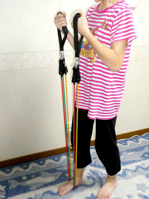 チューブの両端に持ち手付けて、真ん中を足で押さえて引っ張り上げている図。