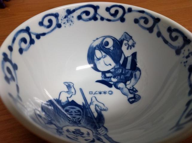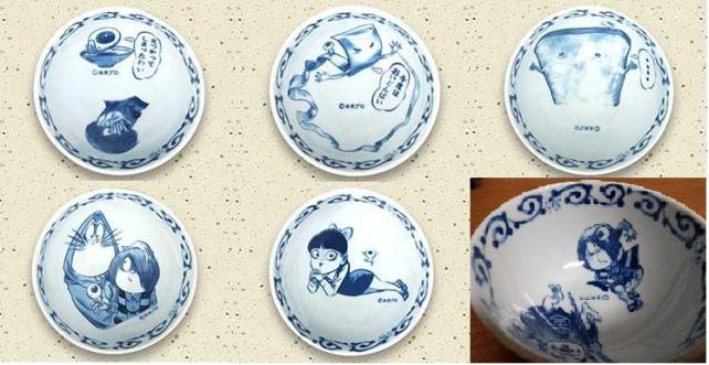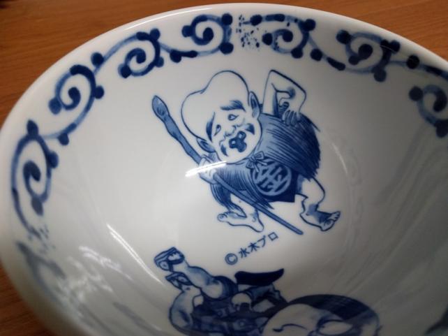 容器にはオリジナルの有田焼を使い、「目玉のおやじ」のお風呂のように外側は無地の素朴な味わいで、食べるにしたがって、妖怪たちが出てくる、楽しいお弁当にしました。