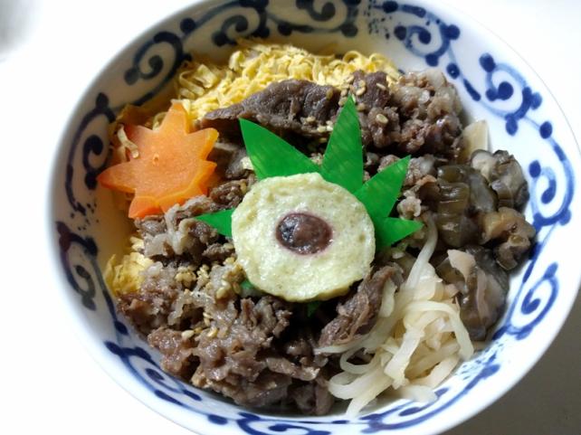 鳥取牛をふんだんに盛り付けた茶碗めし容器には妖怪イラスト入り有田焼を使用。