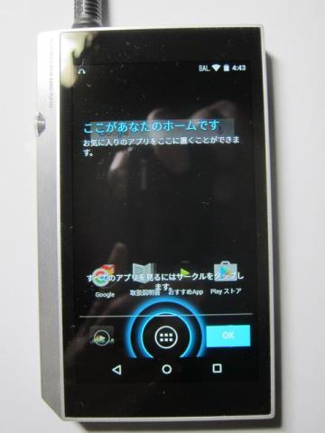 しばらくすると,androidの初期設定画面になります.言語,wifi設定などを行うと,やっとホーム画面になりました.ココまでの感想としては,非常に時間がかかるということで,普通のDAPではなく,android端末であるということを実感させられます.