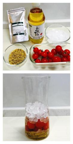 キンモクセイ・トマト・氷砂糖を順にいれ、最後にりんご酢を注ぎ入れる。