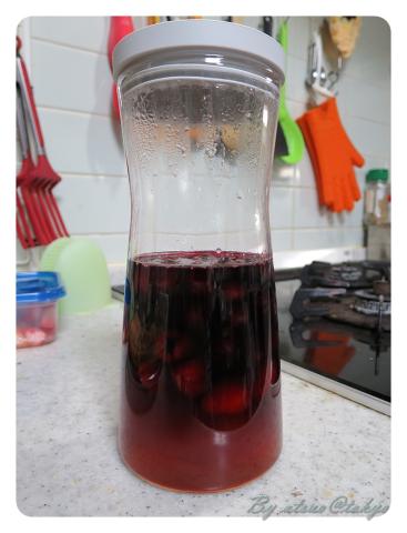 今回は 4種類のお酢を使っての出来上がり比較を行ないたい為、調理後すぐにフルーツを取り出し別容器に移しました。