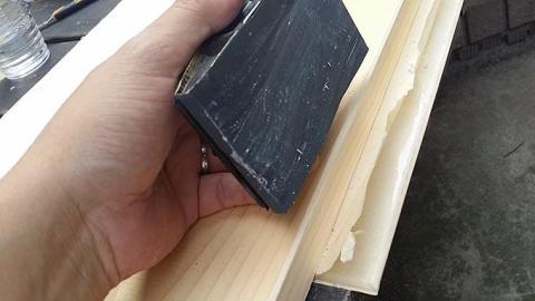 割りっぱなしのアクリルでは綺麗じゃないので、40番の紙やすりを使って30度位のテーパー加工をし、600番の耐水ペーパーで鏡面加工の準備をした。