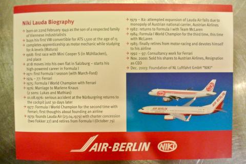 オーストリアで外交官勤務している友人がおりまして、日本への直通便就航を控えたニキエアが出展するレセプションパーティに出席した際に、ニキ・ラウダ本人から配られたポストカードです。