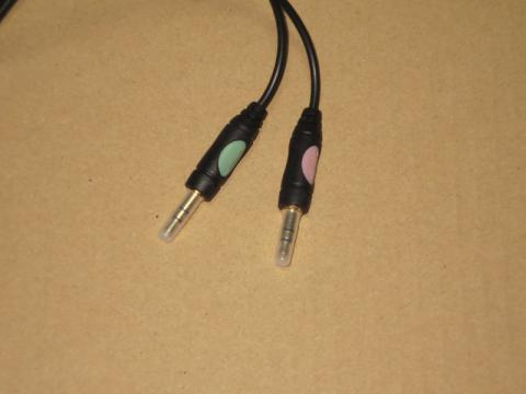 ヘッドフォンにマイクとボリュームコントローラーが付いたヘッドセット。