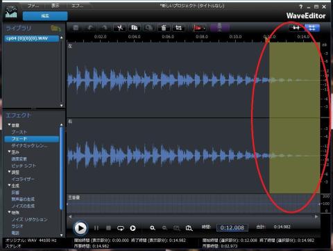 丁度のタイミングに合う音楽素材がありませんでしたが、PowerDirector 15 Ultimate Suiteに付属のWave EditorでMP3のデータをフェードアウトさせます。