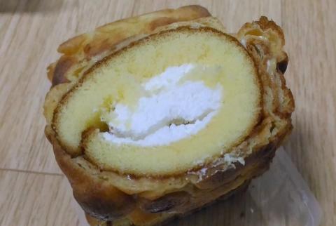 シューロールケーキはやや固めのシュークリームの生地?が巻き付けられたロールケーキで、真ん中には生クリームがたっぷりと入っています。