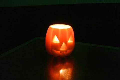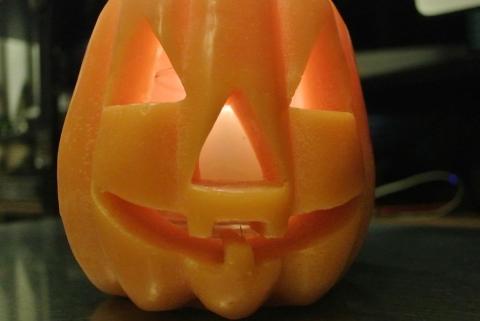 カメヤマローソク製のジャック・オ・ランタンは、かぼちゃ色の本体もロウソク製です。
