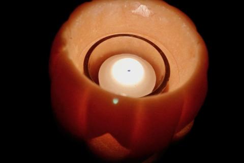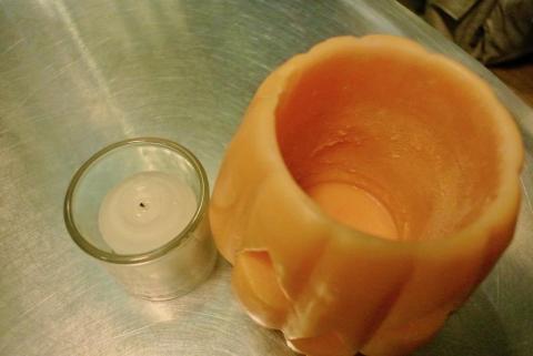 くり抜かれた顔の真ん中にガラスコップに入れた白いロウソクが入ります。