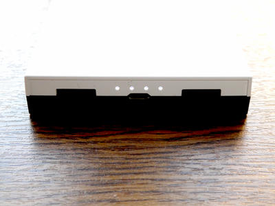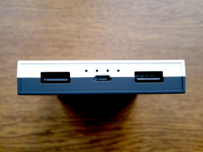 左右に出力用USBポート、中央に入力用MicroUSBポート、その上にインジケータLED。