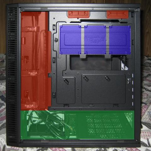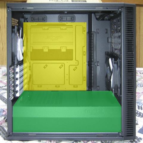 緑色の部分が電源装置カバーで電源、3.5インチドライブケージが覆われ非常にすっきりして見えます。
