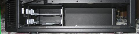 電源装置カバー内は左に3.5インチドライブケージ、右に電源を搭載します。
