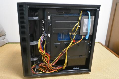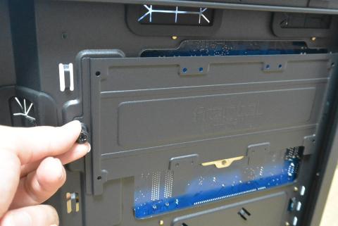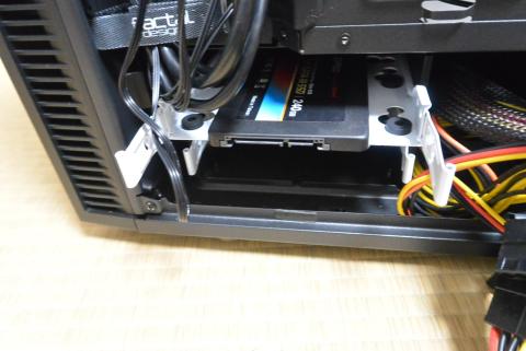 次に、システムの入ったSSDドライブを取り付けます。Define Mini C では、この取り付け位置が変わっており、サイドパネルとの隙間(マザーボードのちょうど裏側)に2.5インチドライブ用の取り付けボードがあり、ネジで取り外しができるようになっています。