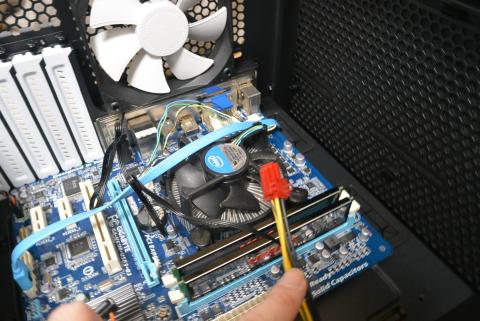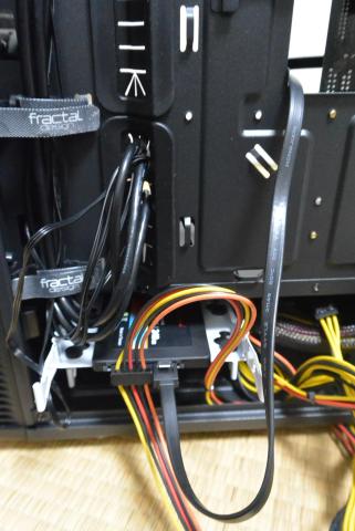 次に、このSSDに電源ケーブルとマザーボードから持ってきたSTAケーブルをつなげた上、前面I/Oパネル用接続ケーブルや電源ケーブルのうちATXメインコネクタ等、必要なものをスリットからマザーボード側に送り込みます。