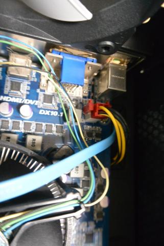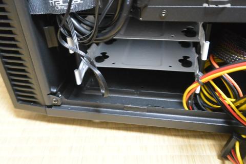 そこで、今回は、PSUシュラウドの下のフロントパネル側に固定しておいた3.5インチドライブケージに取り付けることにしました。