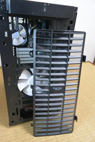 Define Mini C を見て感じるのは、エアフローと防塵に対するこだわりです。まず、吸気は、前面パネルの横のスリットから行う仕組みであり、120mmの大型静音ファンが設置されていますが、オプションで120mmまたは140mmのファンを追加することができます。そして、ケース内部への埃の侵入を防ぐため、全面を覆うフィルターがついています。