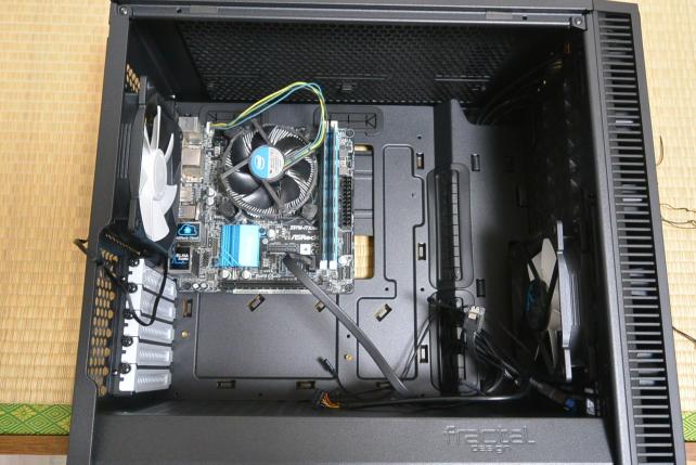取り付けたところは下の画像のとおりです。MicroATXのマザーボードでも余裕がありましたが、Mini-ITXだとスカスカといってもいいくらいスペースが余っています。