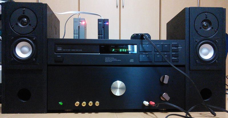 電源スイッチのLEDも無事点灯したので、CDプレーヤーとスピーカーを接続・・・