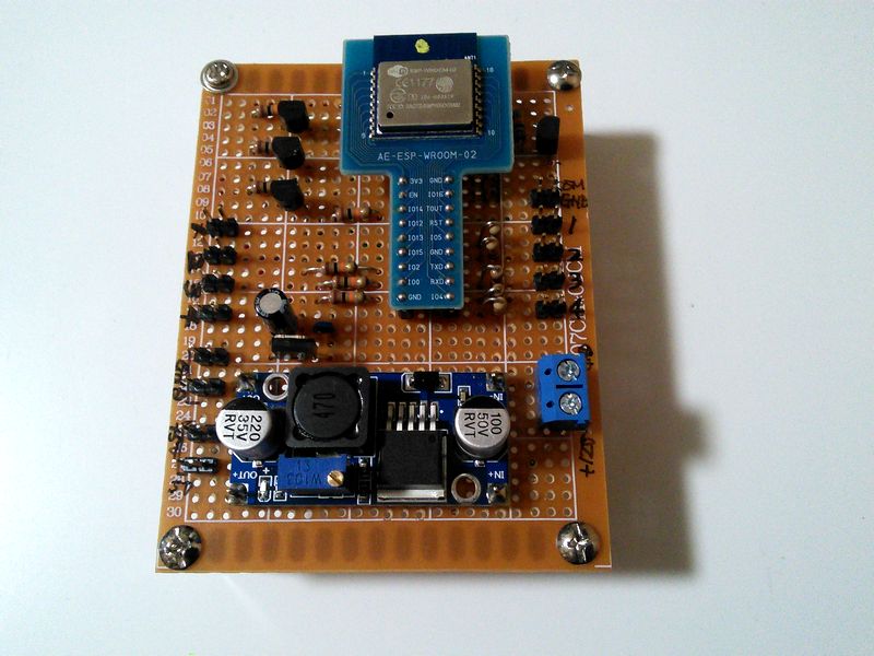 5Vの三端子レギュレーターに手持ちがなかった為、降圧レギュレーター基板で5Vに、そこから更に3.3Vを作ってESP8266に供給。