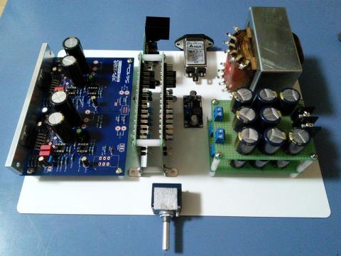 電源はTOYOZUMIのHTR-123の出力を、手持ちの2,200μF/25Vを使った整流・平滑基板に通して供給します。(ダイオードが未入手の為未完成ですが・・・)