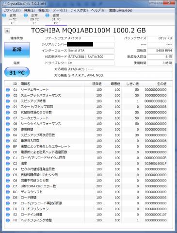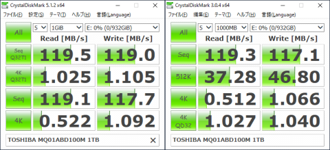 ところでこの「MQ01ABD100M」という型番は今年(2016年)になってから出てきた型番で店によっては「MQ01ABD100」と併売されていて気持ちこちらのほうが高い。M無しのほうを持っていないので推測だが、ネットにある外装写真やベンチに殆ど差はないので同じものと見てしまって構わないきがする。強いて言えばM付のほうが製造が新しい個体を引ける程度?