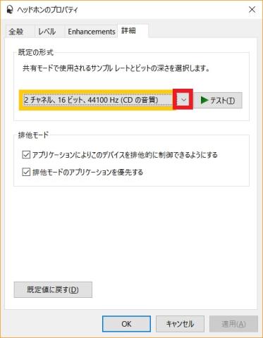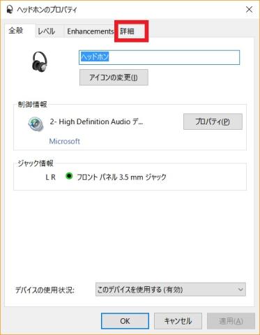 ヘッドホンのプロパティの「詳細」を開いて下さい。