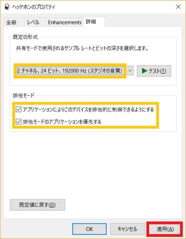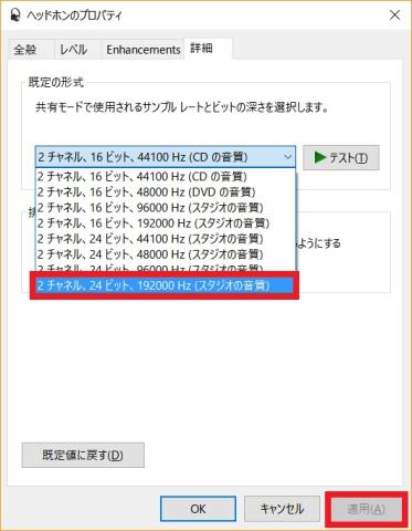 「2チャンネル、24ビット、192000Hz(スタジオの音質)」に設定したことを確認します。